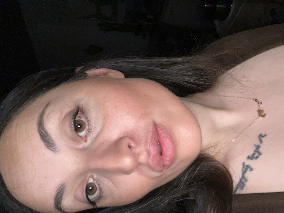 A woman gazes directly at the camera. Her dark hair surrounds her face, framing her features. She has prominent eyebrows, and brown eyes, and full, pink lips. A gold necklace with heart-shaped pendants rests on her chest. A tattoo adorns her upper chest as well. The lighting is somewhat dim, creating shadows that accentuate her features. The background is mostly obscured.