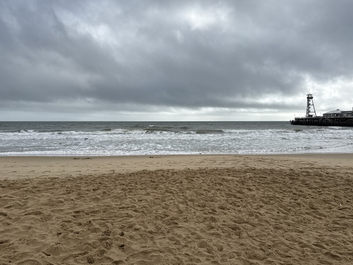 An external, eye-level photograph captures a desolate sandy beach scene in Bournemouth, United Kingdom, under an overcast sky