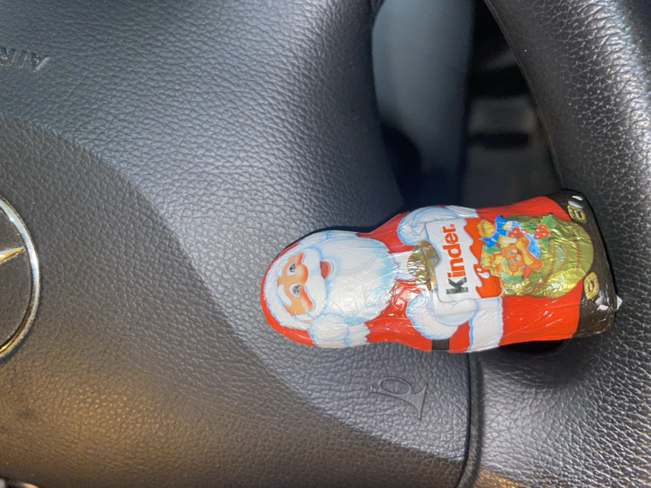 - "A chocolate Santa Claus, wrapped in red, white, and gold foil packaging, sits atop a black leather steering wheel" by FM-UR63Y2, licensed under CC BY 4.0