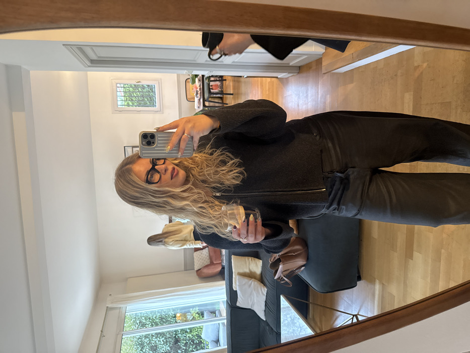 A woman with blonde curly hair and black-rimmed glasses poses in a mirror selfie
