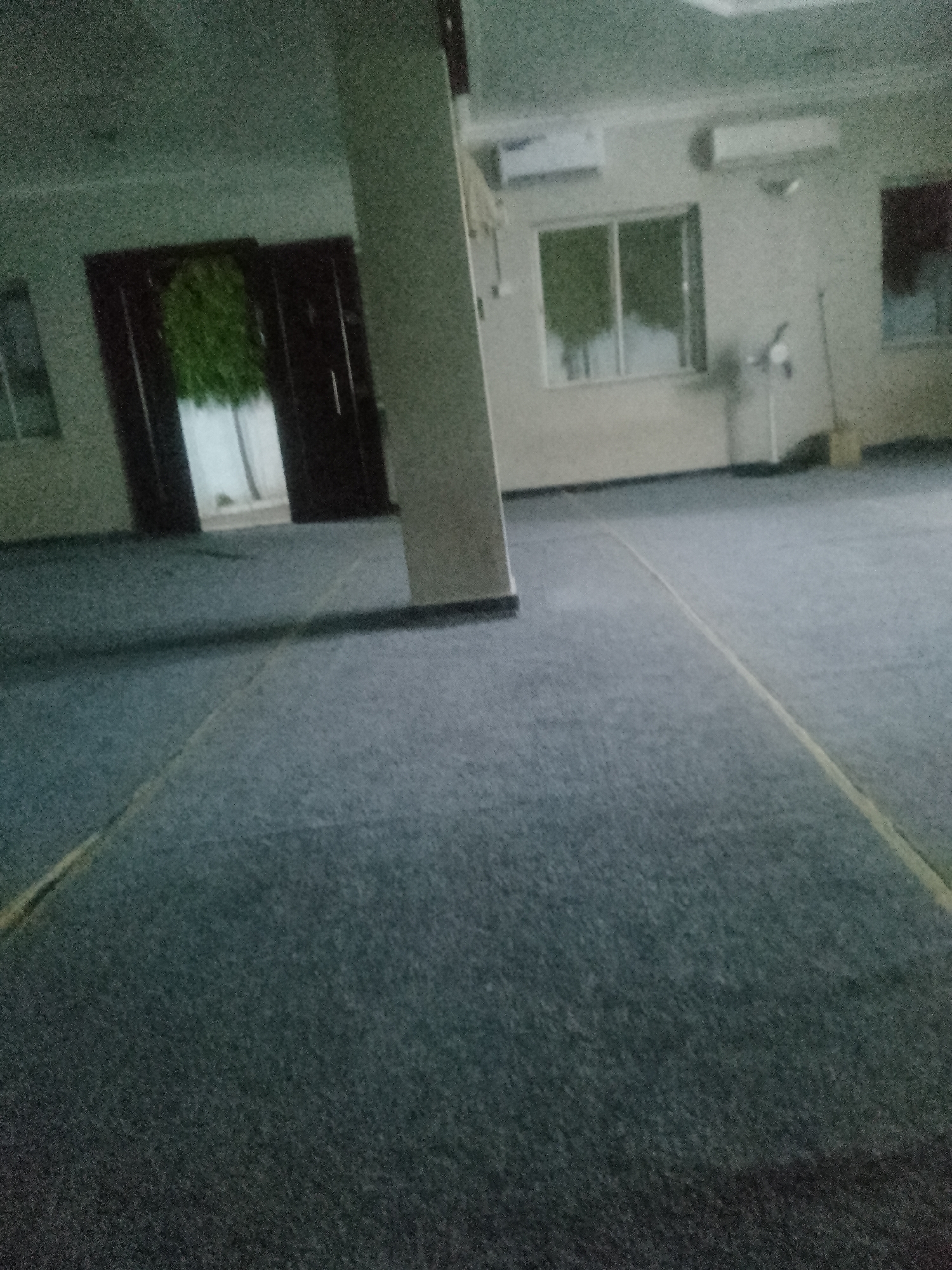 The image depicts the interior of a large room or hall located in Kubwa, Nigeria. The floor is covered with a dark blue-grey textured carpet, marked by distinct light-colored, possibly yellow, linear strips. A prominent rectangular structural column stands centrally in the mid-foreground. The walls are light-colored, appearing off-white or beige, and the ceiling is flat and similarly light-toned. In the left background, a pair of dark, double-leaf doors are partially open, revealing an exterior view with bright natural light and dense green foliage. A faint outline of another window is visible further to the left. Along the right wall, a large window with white frames shows more green foliage and ambient light from outside. Above this window, two white wall-mounted air conditioning units are installed. Below the rightmost air conditioning unit, a floor-standing fan or similar mechanical device is positioned on the carpet. A light-colored broom with a long handle is leaning against the right wall, adjacent to the window. Further to the right, a darker opening or doorway is partially visible. The room is empty of people, and no actions or interactions are occurring. The overall lighting is moderate, with a slight dimness contributing to the ambient atmosphere.