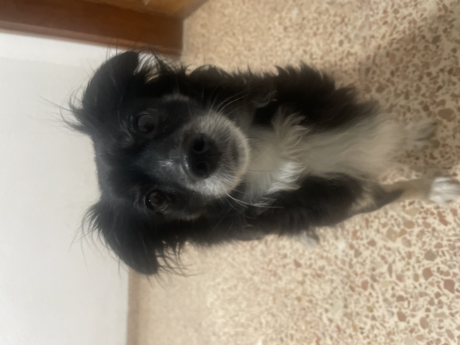 A black and white, medium-sized dog gazes upward with a curious expression. The dog has long, shaggy black fur and white markings on its chest and muzzle. The dog’s coat is thicker around the neck. The dog is standing on a speckled, neutral-toned floor. A cream-colored wall and the edge of a wooden doorframe are visible in the background. The dog appears to be indoors.