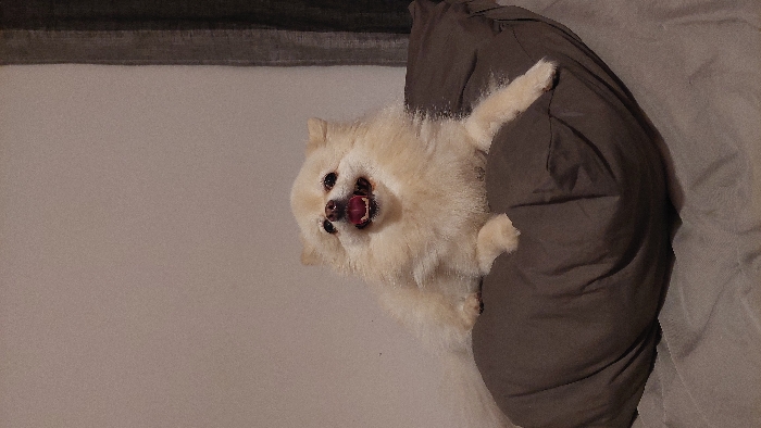 An indoor residential setting, Unknown, Unknown. A cream-colored Pomeranian dog is positioned centrally, lying on a dark brown pillow. The dog faces forward with its mouth open, revealing its tongue and teeth, indicative of vocalization or panting. Its front paws rest on the pillow. The background consists of a plain light-colored wall. A dark brown vertical fabric element, consistent with a curtain, is visible on the right side of the frame. A light gray textured textile, likely bedding, is partially visible beneath the pillow in the foreground.