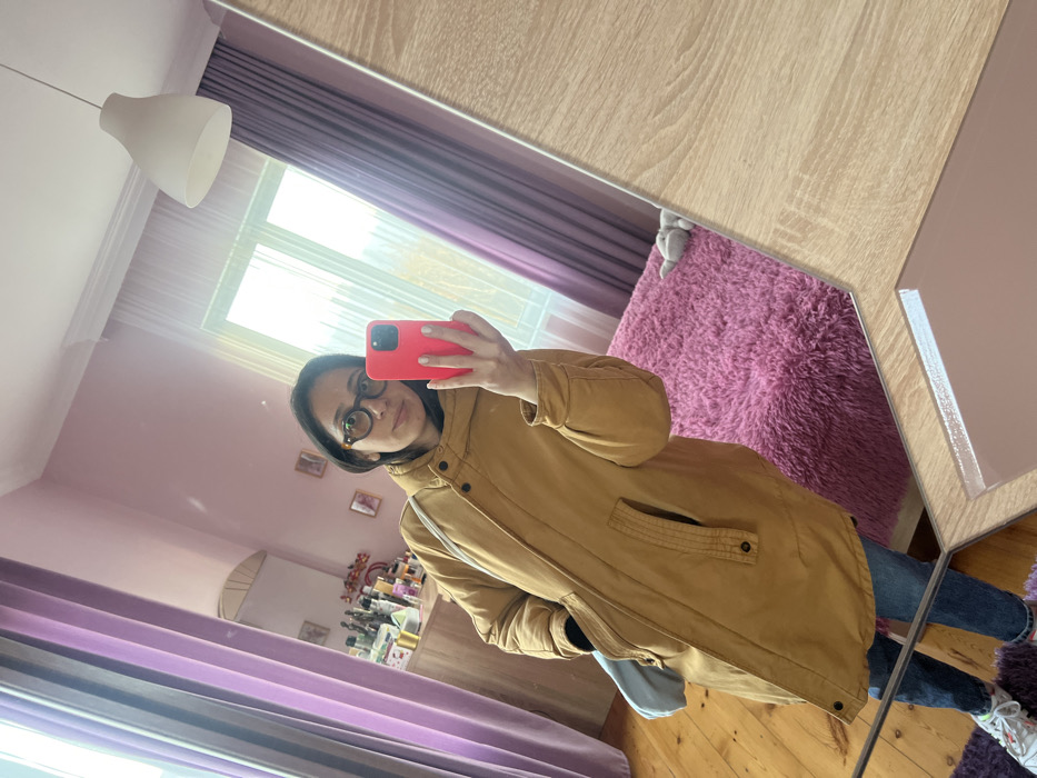 A woman with glasses takes a mirror selfie. She is wearing a tan-colored parka and blue jeans. A pink rug and purple curtains are reflected in the mirror. A white lamp hangs from the ceiling, and a window lets in natural light. Various items are on a shelf or dresser behind her. She holds a red phone, presumably used to take the photo.
