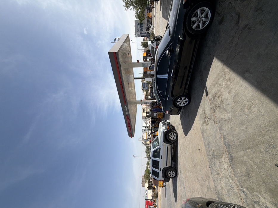 This image depicts a TotalEnergies gas station identified as "200 ROAD" in Gandu Albasa, Nigeria, under a clear blue sky with minimal wispy clouds. The scene is illuminated by direct sunlight, casting distinct shadows on the paved concrete ground. In the foreground and midground, a silver Jeep Liberty SUV is positioned to the left, slightly angled towards the fuel pumps. To its right, a black sedan, possibly a Toyota Camry, with chrome window trim, is parked, also facing the direction of the pumps. Beneath the gray canopy of the gas station, which features a red perimeter trim, multiple fuel pumps are visible. Several individuals, likely fuel attendants, are present near these pumps, appearing to service vehicles or wait for customers. Further into the background, a cluster of yellow motorized tricycles, commonly known as "kekes," are parked or waiting near the station's entrance or along the adjacent road. Additional vehicles and buildings typical of an urban environment are visible in the background. The overall impression is one of a busy day at a fuel station.