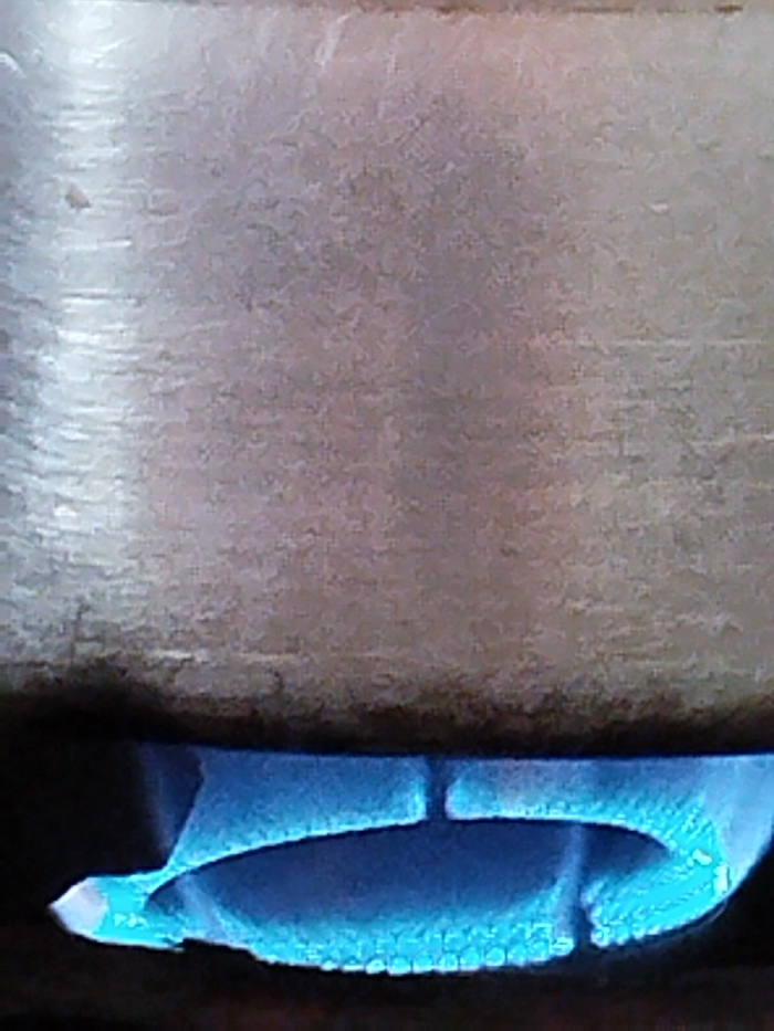 - "A close-up image depicts the underside of a metallic cooking vessel, likely a pot or pan, positioned directly above an active gas burner" by FM-88V7z1, licensed under CC BY 4.0