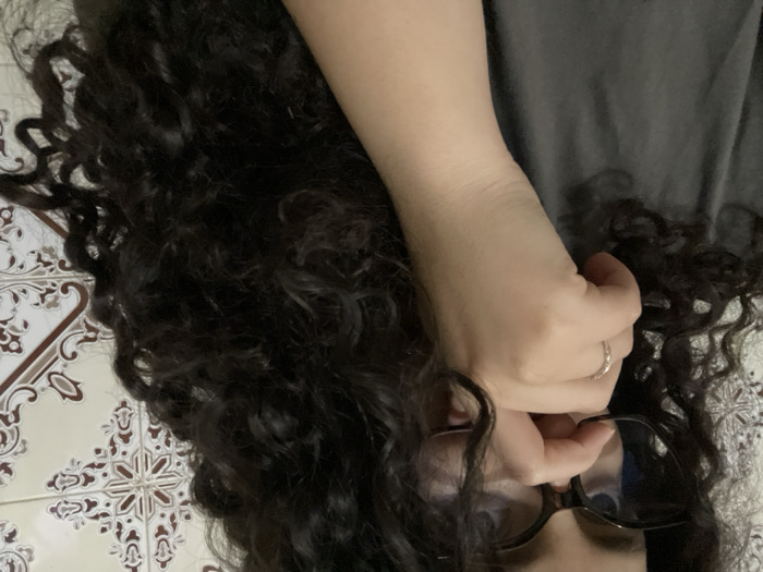 An individual is captured in a close-up, head-and-shoulders portrait. The subject wears dark-framed glasses, with eyes visible looking upward. Dark, curly hair is prominent, framing the face and extending across the shoulders. The subject's left hand, featuring a ring on the fourth finger, is raised to the face, with fingers positioned at the bridge of the glasses, suggesting adjustment. A grey garment covers the upper body. The background is a tiled wall displaying cream-toned, interlocking geometric patterns in brown, reddish-brown, and grey. Although the specific site within Fez, Morocco, cannot be identified from this image alone, the tilework style is characteristic of traditional Moroccan Zellige, commonly observed in the city's architecture.