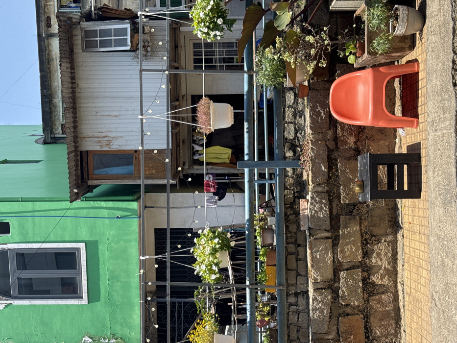 The image displays a multi-level urban facade in Da Lat, Vietnam, under bright daylight. In the foreground, a light-colored paved area features a small, dark rectangular stool with a brass-colored circular object on its surface, positioned next to an empty, bright orange plastic chair. To the right of the chair, several potted plants are visible on the ground. Behind the paved area, a dry-stacked stone wall, approximately two meters in height, exhibits varying shades of brown and grey. Above this wall, a blue metal railing defines a balcony or terrace space. This area contains numerous potted plants of various sizes and types arranged along the railing and on surfaces behind it. Three white hanging planters are suspended from a horizontal string light wire system above the railing; two outer planters contain white-flowering plants, and the central one holds reddish-purple foliage. The string light system features small, clear globe bulbs. In the background, two primary building sections are evident. To the left, a multi-story building painted bright lime green displays peeling paint and features a large, dark-framed window on its upper floor, with a blue conduit or pipe running vertically. To the right, a smaller structure, characterized by white corrugated metal siding showing rust, includes a wooden door with a glass panel on its left and a small, white-framed window on its right, all beneath a corrugated metal roof. Below these upper structures, a lower white facade with dark grate-like windows is partially visible, revealing an open area where various items of clothing, including red and yellow garments, hang to dry. No individuals are present in the scene.
