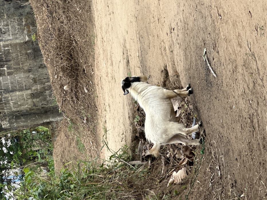 - "A white goat with a black head, small horns, and a short beard stands tethered on an uneven dirt path in Uyo, Nigeria" by FM-jhOse2, licensed under CC BY 4.0