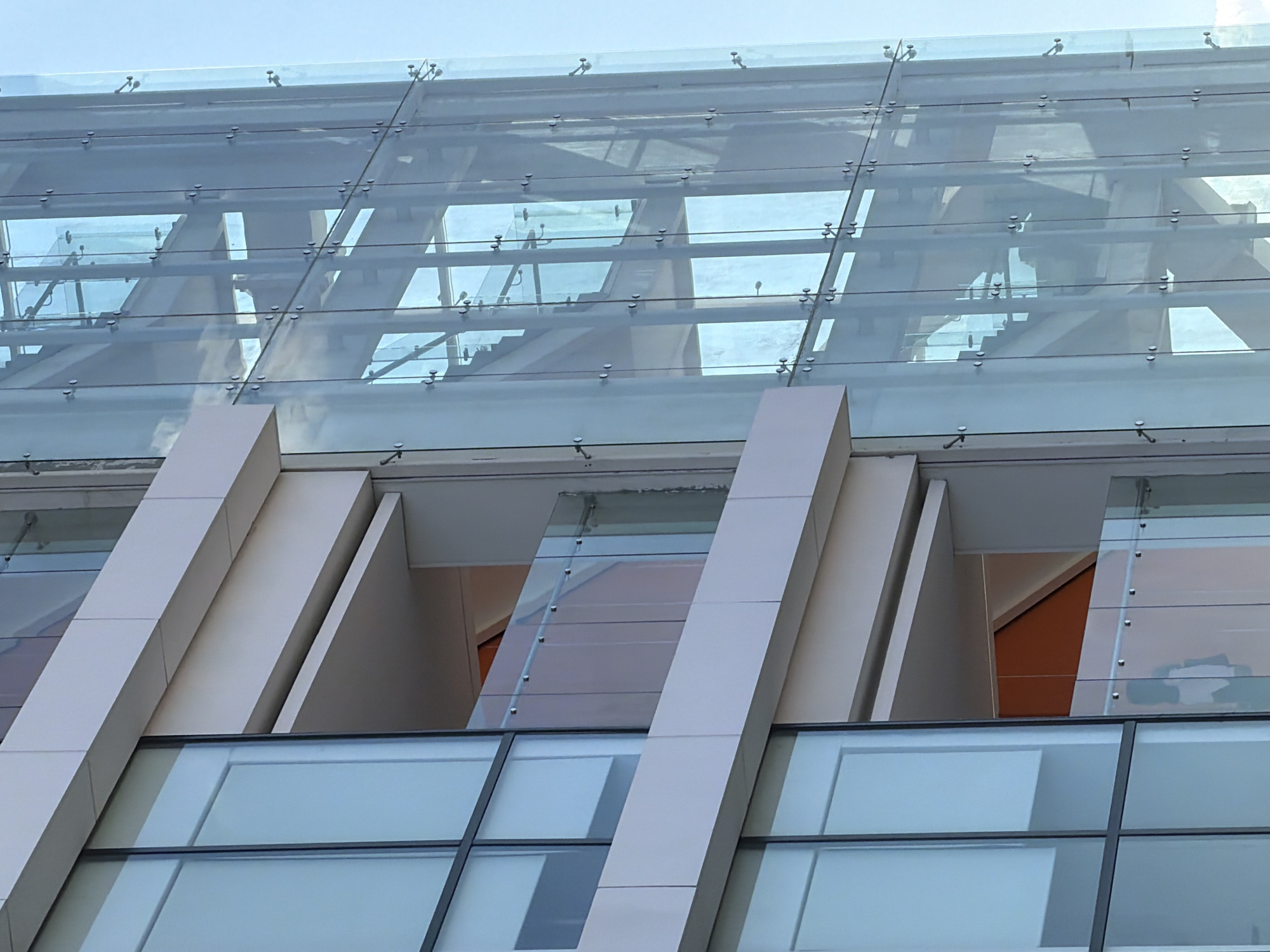 The image displays a detailed, upward-angled view of a modern multi-story building facade in Fraccionamiento Los Heroes Queretaro, Mexico, under clear daylight conditions. The left portion of the building features light-colored, possibly off-white or light gray, horizontal paneling delineating floor levels. These panels frame large, rectangular windows with dark-colored mullions, reflecting a light blue sky. Below one of the upper panels, a recessed balcony area is visible, enclosed by a clear glass balustrade secured with small metal fixtures. An interior wall within this balcony appears to be an orange-brown color. The right portion of the image is dominated by a transparent, multi-story glass curtain wall, characteristic of a point-fixed glazing system, with numerous circular spider fittings securing the individual glass panels. Behind this transparent facade, the internal structure of a staircase is discernible, composed of light-colored, possibly concrete or metal, risers and stringers, ascending diagonally. Light filters through and reflects off the glass surfaces, creating varied tones and shadows within the stairwell. No individuals or specific actions are visible within the frame.