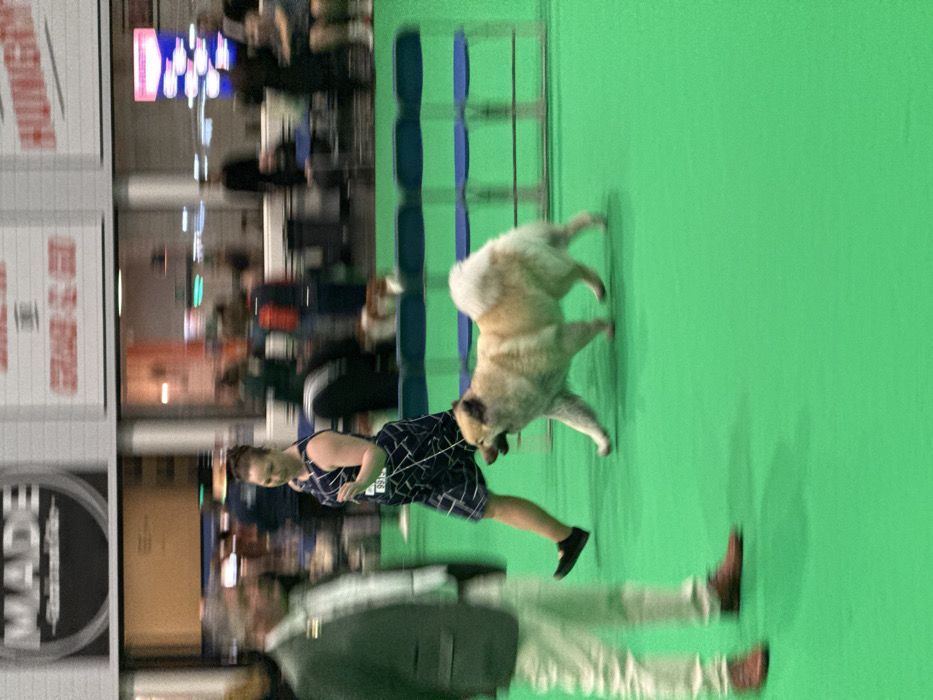 The image captures an indoor dog show event at the National Exhibition Centre (NEC) in Birmingham, United Kingdom