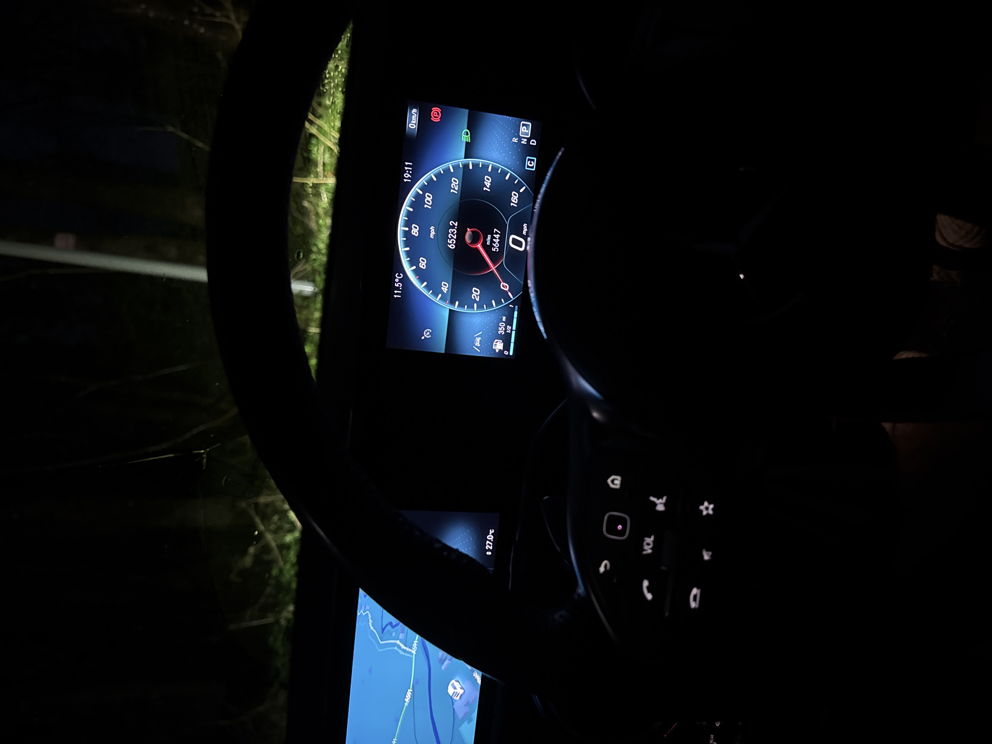 The scene depicts the interior of a vehicle at night, specifically from a driver's perspective, located in Troutbeck Bridge, United Kingdom. The vehicle is stationary with a displayed speed of 0 mph. The digital instrument cluster shows an outside temperature of 11.5°C and the current time as 19:11. The odometer reads 5644.7 miles, with a trip counter at 6523.2. A fuel range of 350 miles is indicated, and the vehicle is in Park ("P") gear, with dipped headlights and the parking brake engaged. To the left, a navigation screen displays a map featuring the A591 road and a white car icon, along with an interior temperature reading of 27.0°C. Portions of a multifunction steering wheel, equipped with illuminated controls for volume, calls, and other functions, are visible in the foreground. Through the windshield, dark, dense foliage and trees are dimly illuminated, primarily at the base, and a light-colored, vertical pole or post is visible against the dark background. No people are discernible within the image.