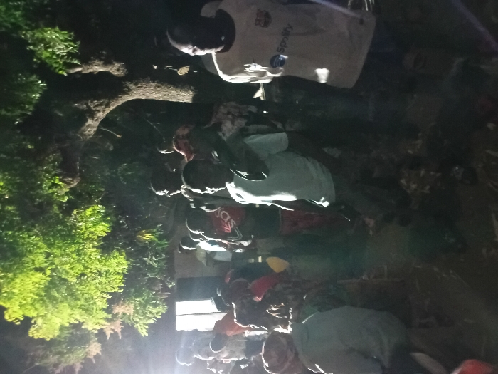 A gathering of people outdoors, possibly at night. A tree trunk lies horizontally across the image, with dense foliage on the left. Individuals wear casual clothing. One person has a white backpack with "Spotify" and a logo visible. Some wear hoodies and sweatshirts. The lighting appears to be dim, with a few bright spots. A glimpse of a building structure is visible in the background. The overall scene is dense and dimly lit.