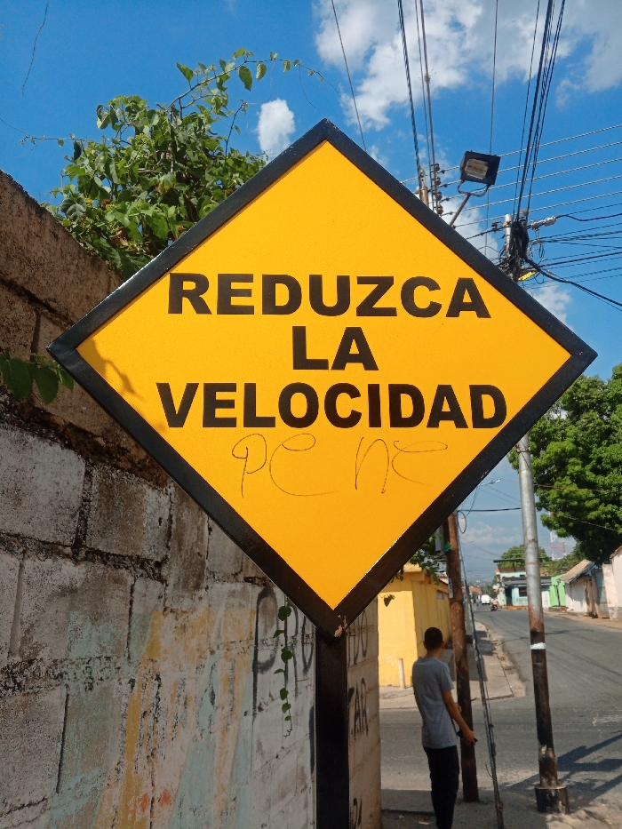 - "A yellow, diamond-shaped street sign with the words "REDUZCA LA VELOCIDAD" (Spanish for "reduce the speed") written in bold, black letters" by FM-67jFM2, licensed under CC BY 4.0