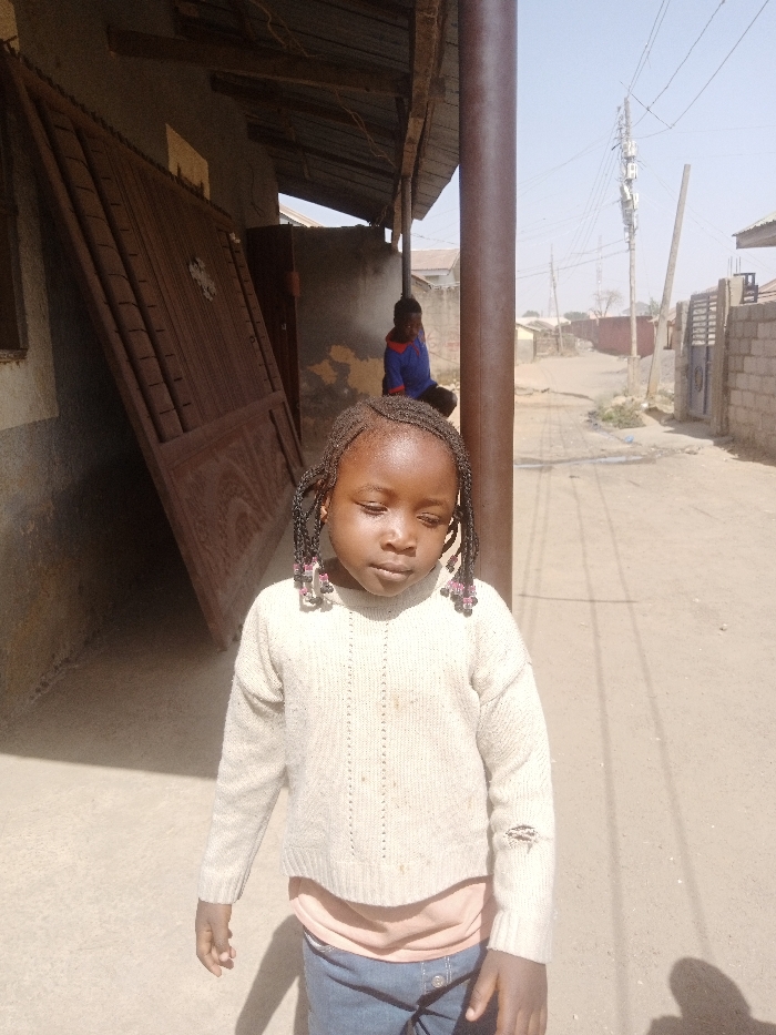 The image depicts a bright, sunny outdoor scene on an unpaved road in a residential area of Jos, Nigeria. In the foreground, a young child, appearing to be a girl, stands facing slightly left with her eyes partially closed and directed downwards. She has dark skin and her hair is styled in multiple short braids adorned with small pink, black, and purple beads. She wears a cream-colored, long-sleeved knitted sweater over a light orange undershirt and blue jeans. The sweater exhibits some dark staining on the front and a small tear on the left sleeve. Her hands are visible at her sides. Behind the foreground subject and to the left, a light-colored building wall is visible. Leaning against this wall, under a dark corrugated metal overhang, is a large, dark brown wooden gate with carved or paneled detailing. To the right of the gate, beneath the same overhang, a second individual, a person of indeterminate age (likely a child or youth), is seated, wearing a blue top with red trim. Their face is obscured by shadow and distance. A dark brown cylindrical pillar supports the overhang to the right of the foreground child. The background reveals a dusty, unpaved road extending into the distance, flanked by various residential structures constructed primarily from concrete blocks, some with corrugated metal roofs. On the right side of the road, a blue metal gate is visible. A tall utility pole, laden with multiple cross-arms, numerous wires, and several box-like attachments, stands prominently against a clear, light blue sky. Sparse dry vegetation is visible further down the road. The overall lighting indicates strong sunlight casting defined shadows.