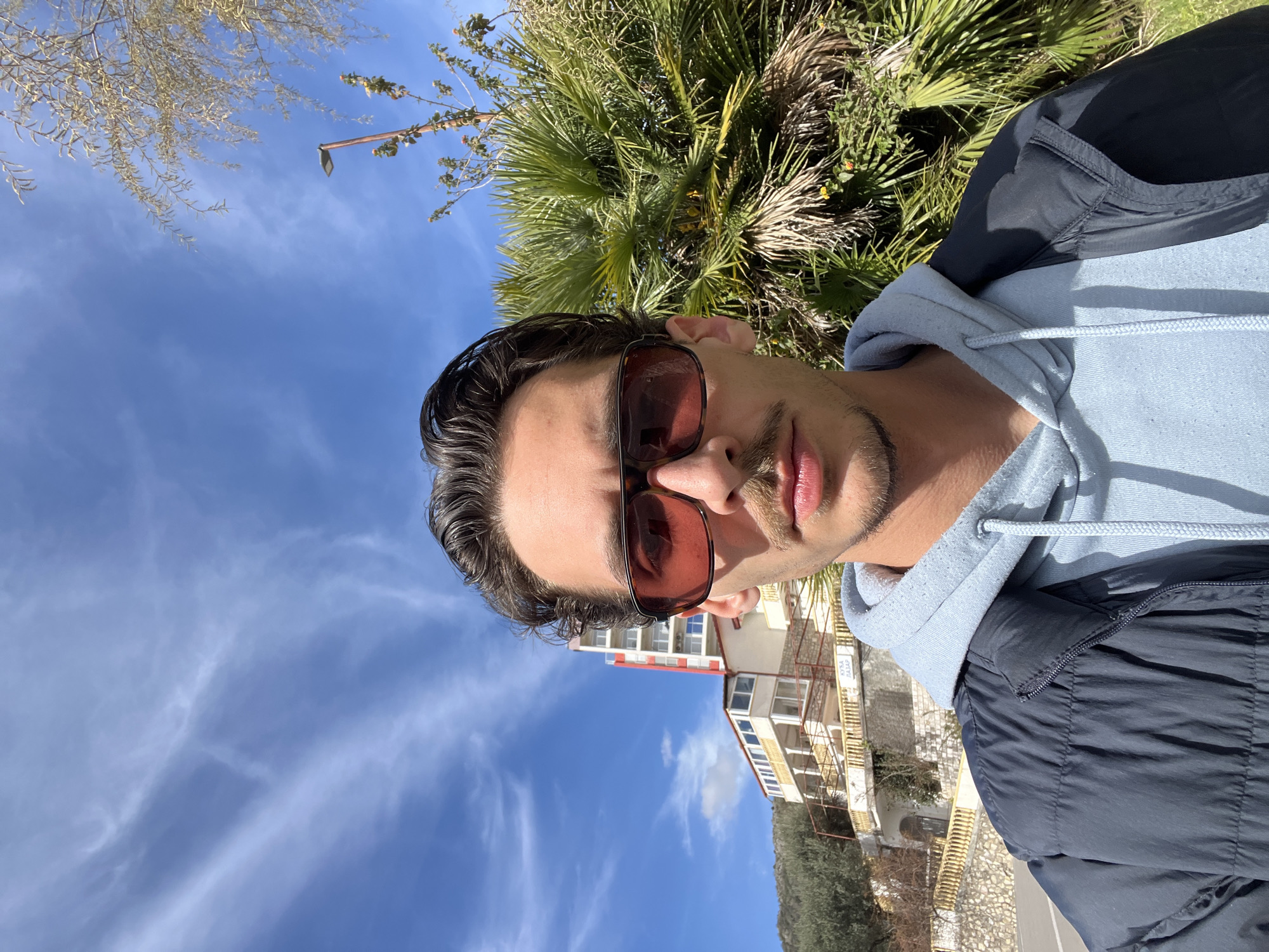 selfie of a man wearing sunglasses, a light blue hoodie, and a dark jacket. He has dark hair and a mustache. Behind him is a building, a palm tree, and a clear blue sky with light clouds. Based on the style of the building and the presence of palm trees, this image was taken in Budva, Montenegro.