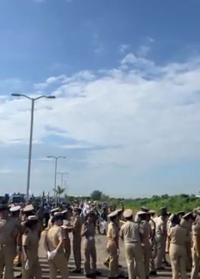 A group of people wearing what appear to be tan or khaki-colored uniforms and peaked caps stand outdoors. They are gathered on what seems to be a paved surface or road, with streetlights lining the edge. In the distance, there are vehicles and what appear to be flags. The sky is blue with scattered clouds. The people seem to be waiting or gathering, with some gesturing and talking. The overall impression is of a formal gathering or assembly, possibly related to a military or law enforcement function.