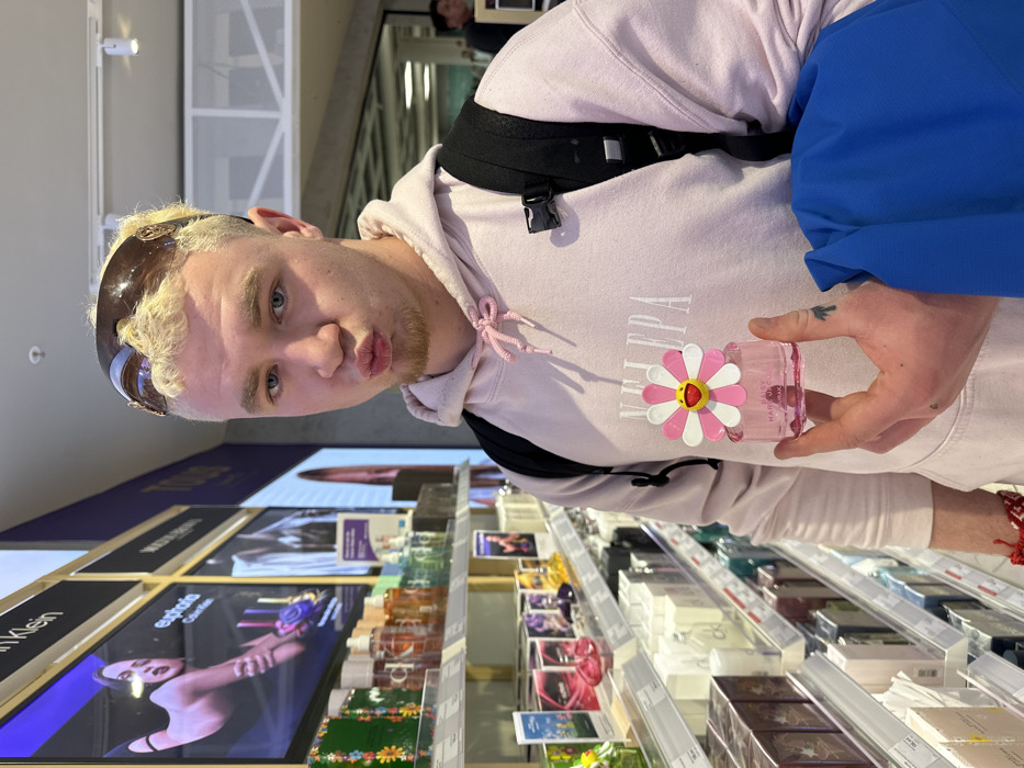 A young Caucasian male, approximately in his 20s, with bleached blonde hair and a light blonde goatee, is depicted from the chest up in a retail store's fragrance section