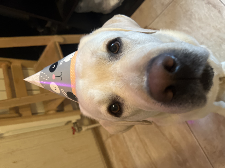 A close-up, eye-level image captures a light-colored Labrador Retriever dog indoors in Mytishchi, Russia. The dog, positioned centrally, wears a grey conical party hat adorned with multiple cartoonish cat faces and an orange polka-dotted band. Its dark brown eyes are open and directed forward, with a dark, wet-looking nose prominent in the foreground. The dog's fur appears short and light-toned. In the blurred background to the left, a light-colored wall with a white pipe and a red valve is visible above a brownish-tan tiled floor. To the right, a darker area contains a partial view of a wooden structure, possibly furniture. The scene is illuminated by indoor lighting.