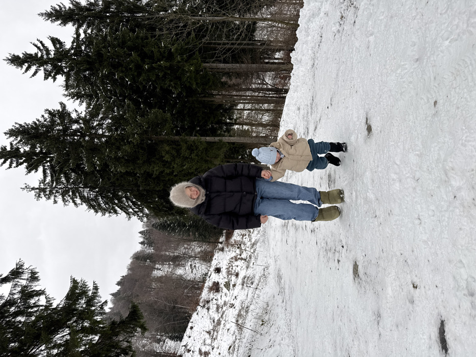 - "A woman wearing a black puffy jacket, blue jeans, and green boots stands on a snowy slope next to a small child" by FM-SHEMl1, licensed under CC BY 4.0