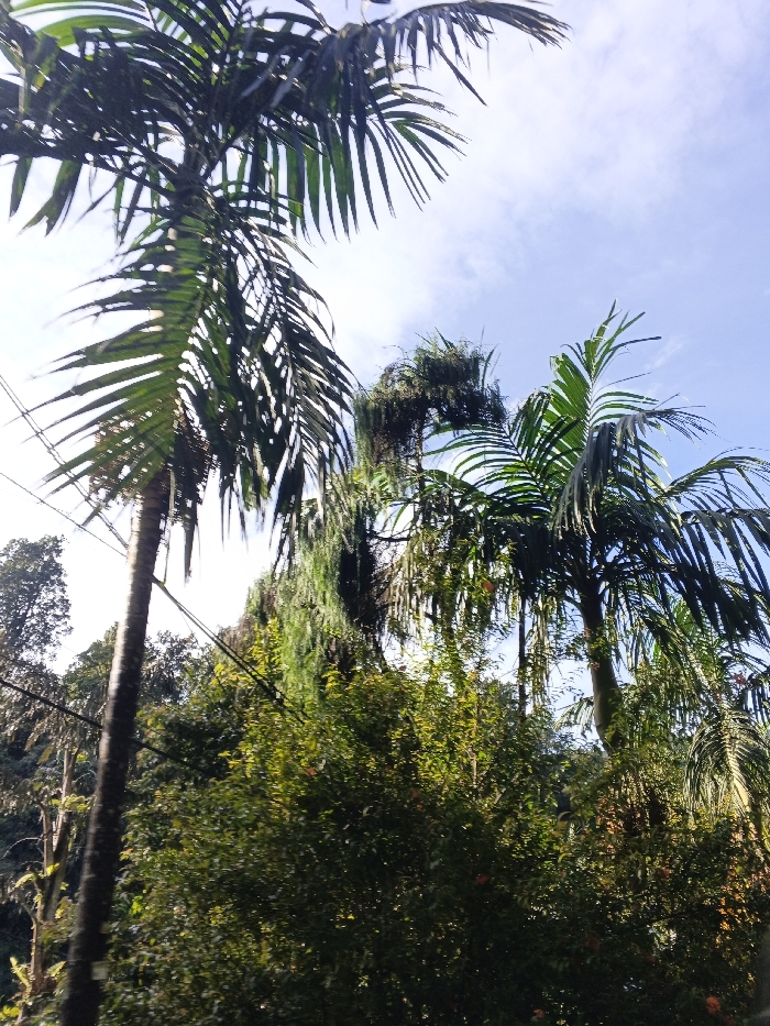 Lush greenery fills the frame, dominated by various trees, including tall palm trees with long, slender trunks and feathery leaves against a partially cloudy sky. Denser foliage is present in the midground, offering depth. Some utility lines are visible, subtly contrasting with the organic scene. The lighting is bright and natural.