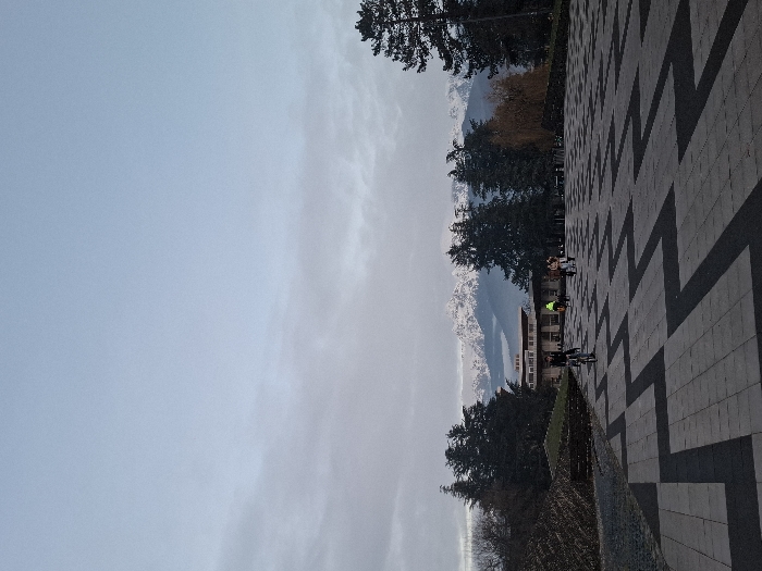 A wide shot of a mountainous landscape features a blue sky with wispy clouds on the left. On the right, a patterned pavement leads to a row of trees and a building. Several people are visible near the building and along the walkway. Snow-capped mountains are seen in the distance. The overall scene suggests a park or outdoor recreational area with natural scenery.