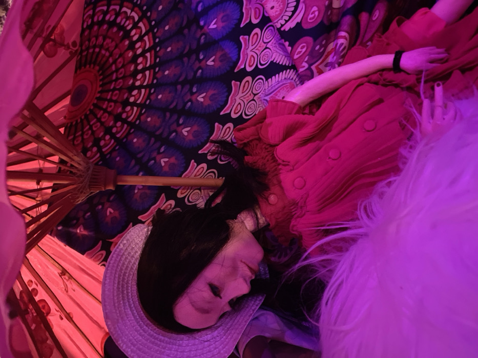 An artfully arranged mannequin lies under a patterned umbrella, its face visible under a light blue hat. The mannequin is dressed in a red dress with visible buttons. A large white feather boa is positioned close to the mannequin's face. The background features a patterned tapestry with mandala-like designs and floral motifs. The overall color palette is dominated by shades of red, pink, purple, and blue.