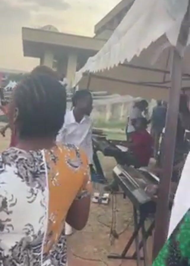 A camera circles to the right into a tent where a band is performing, including a drummer playing a blue drum kit. The band is surrounded by people who appear to be listening and enjoying the music. The performance appears to be outside in a lawn.