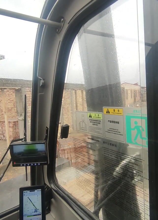 The view from inside a vehicle on a cloudy day captures construction activities outside. Through the windshield, a partially-constructed brick building is visible. A large object, possibly a slab or structure, is suspended by chains from above, against a gray sky. Inside the vehicle, two small screens are mounted on the dashboard. One displays what appears to be a live feed, while the other shows a map or tracking application. Wipers are positioned across the windshield, and a metal support bar is visible on the left side. The overall scene suggests construction work in progress, as viewed from the operator's cab of a crane or similar equipment.