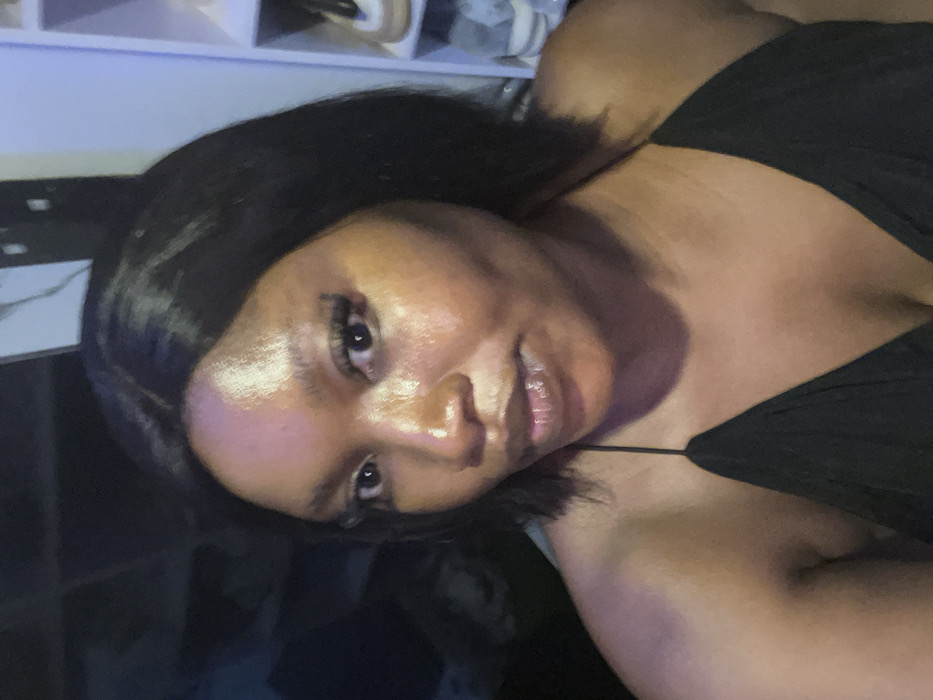 A dark-haired woman gazes at the viewer. She is wearing a black, strappy top. Her skin is glowing, and her lips appear glossy. She seems to be indoors with what looks like furniture and decorations in the background. The lighting is soft, creating a warm and intimate ambiance. Her expression is serene and slightly flirtatious.