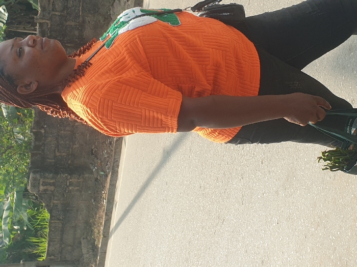 A woman with light brown hair braided in small sections is walking on a paved sidewalk. She is wearing a bright orange, short-sleeved textured top with a white and green accent on the shoulder. She is wearing dark-colored pants and carrying a dark-colored bag. A stone wall with plants growing beside it is on the left side of the frame. The sidewalk appears to be concrete and well-lit.