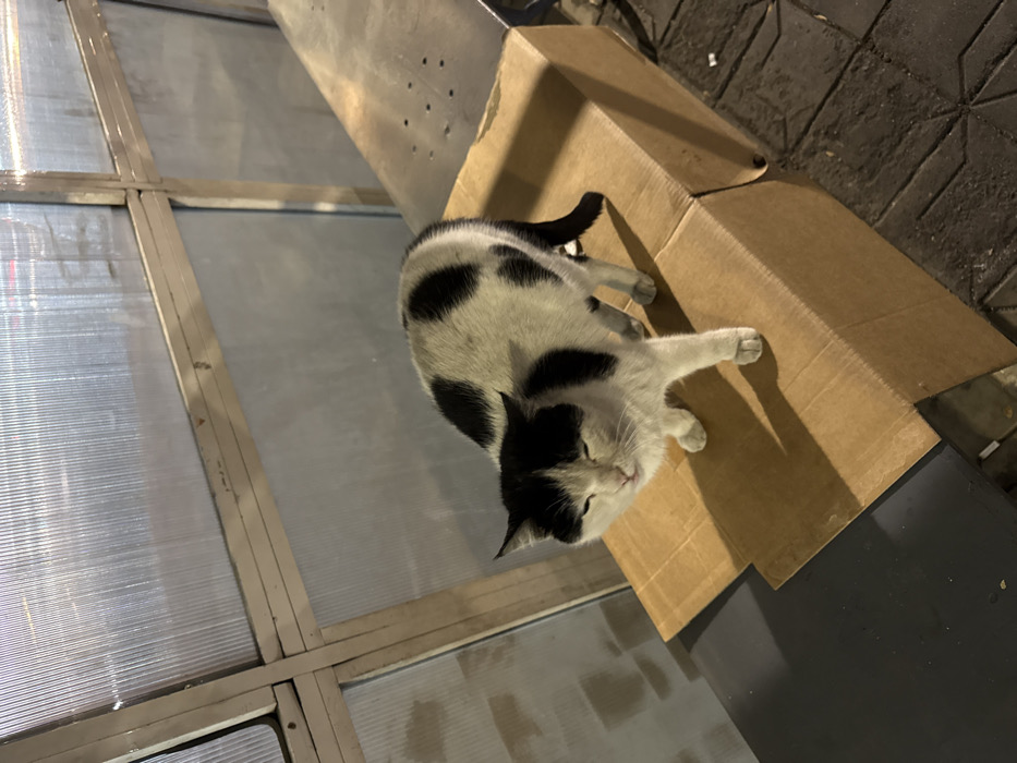 - "A black and white cat rests on a cardboard box placed on a ledge" by FM-AtE073, licensed under CC BY 4.0