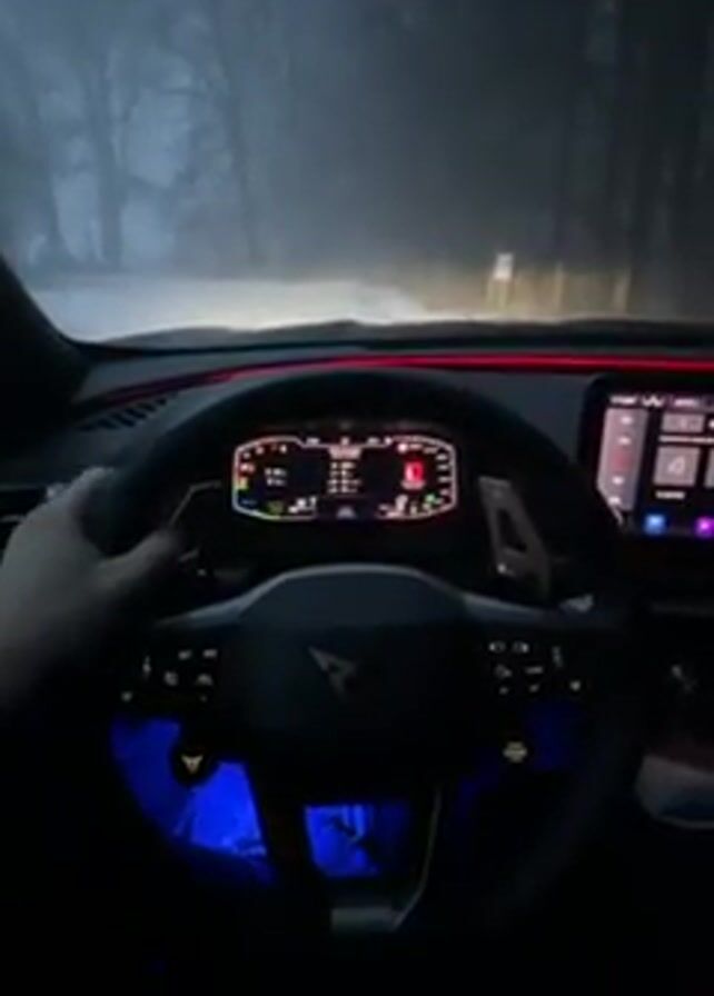 person sitting in the driver's seat of a car, gripping the steering wheel. The car is on a road covered with snow and ice, with trees visible in the background through a thick fog. The car's dashboard is lit up with digital displays and red and blue LED lighting. The person's hands are visible on the steering wheel, suggesting they are in control of the vehicle. The car's headlights are on, illuminating the snowy road ahead. The interior of the car is dark, with the lights highlighting the modern design of the dashboard and steering wheel.