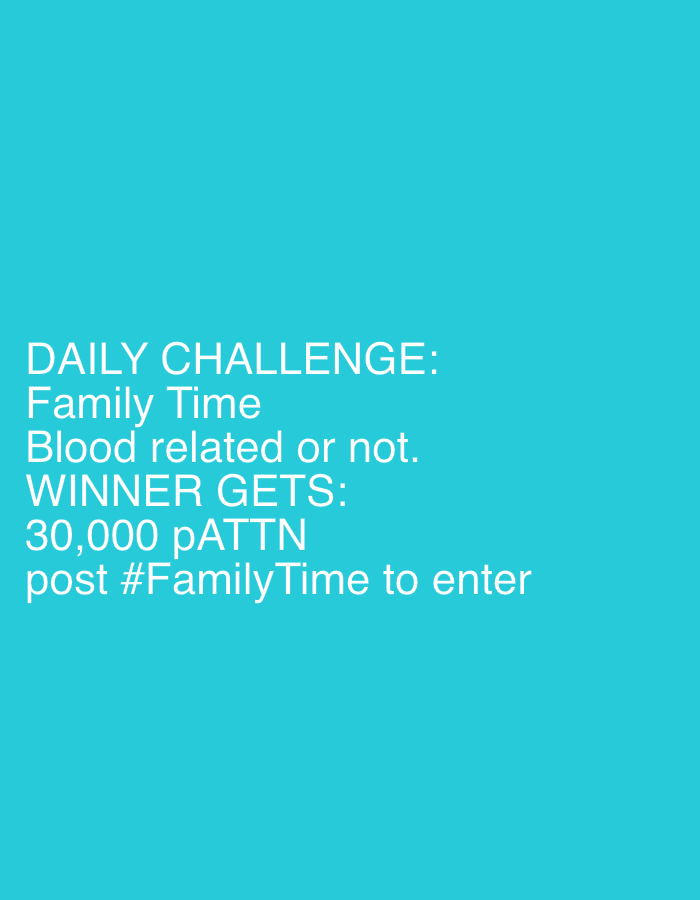 The image displays a digital graphic featuring white sans-serif text centered vertically on a uniform teal background (approximate hex color #00BFB3). The text reads: "DAILY CHALLENGE: Family Time Blood related or not. WINNER GETS: 30,000 pATTN post #FamilyTime to enter". No individuals, specific physical objects beyond the text, actions, or interactions are depicted. The background is a flat, untextured color field. A specific location within the city of Oralki, Russia, is not visually represented or indicated in the image.