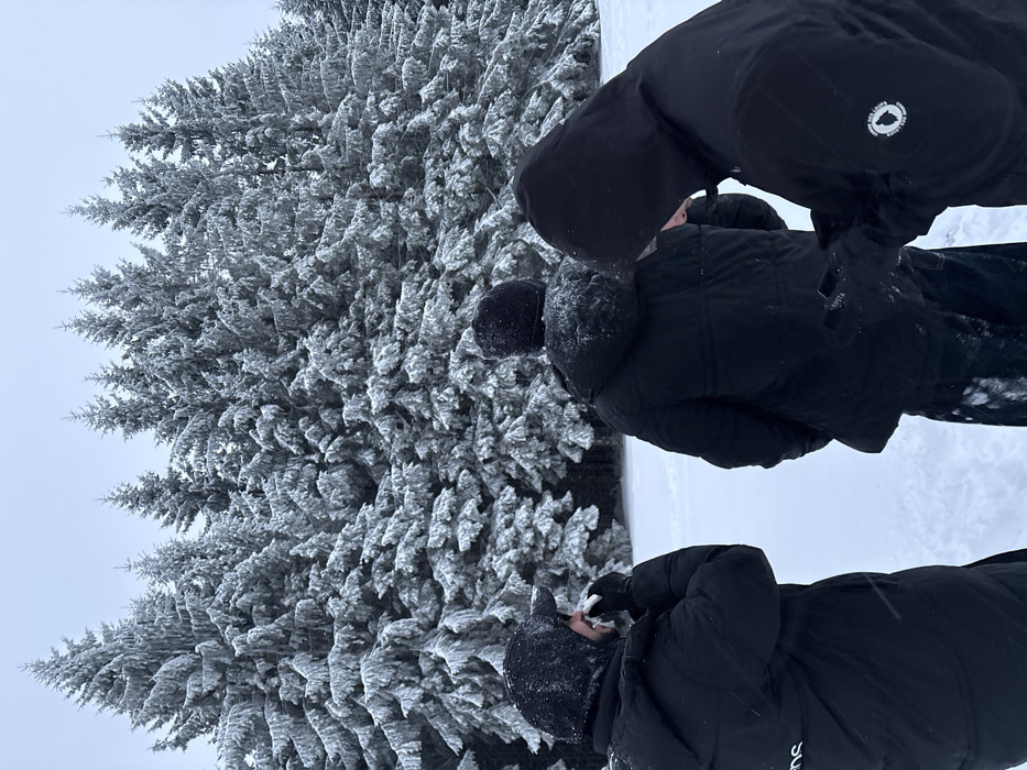 In Le Hohwald, France, three individuals are observed outdoors in a dense, snow-covered forest environment