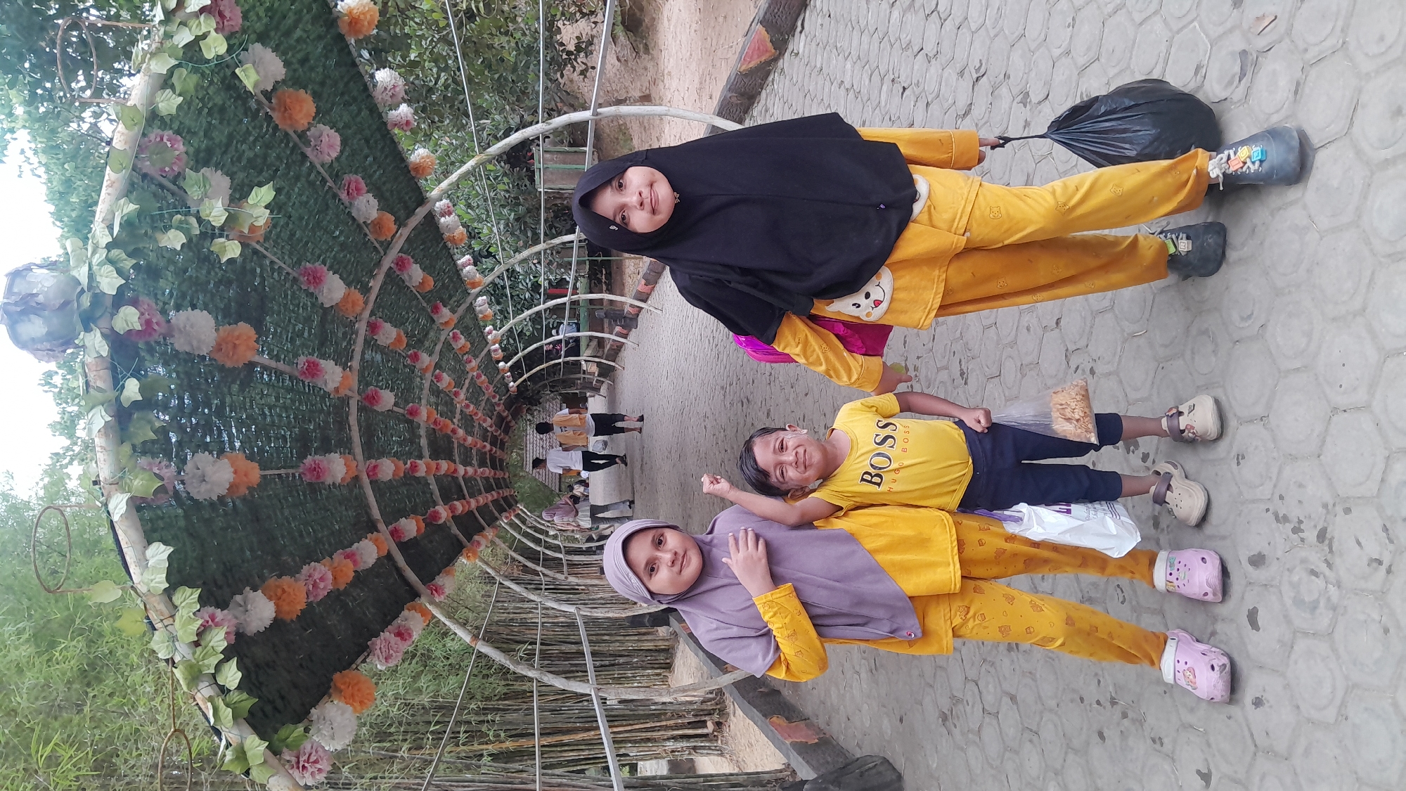 The image depicts three children posing on a hexagonal-paved pathway under a decorative arched tunnel in Lhokseumawe, Indonesia. The tunnel structure consists of a metal framework covered with green mesh, from which numerous artificial pink, orange, and white pom-pom flowers and green leafy vines hang. In the foreground, from left to right: 1. A female child wears a purple hijab, a yellow long-sleeved top, yellow patterned pants, and pink Crocs. Her right hand rests on her chest, and she looks directly at the camera. 2. A male child stands between the two girls, wearing a yellow t-shirt with "BOSS HUGO BOSS" printed on it, dark blue cropped pants, and light brown sandals. His right hand is raised in a fist, and he has a faint smile. His left hand holds a small white plastic bag and a clear plastic bag containing orange snacks. He holds hands with the girl on his right. 3. A female child wears a black hijab, a yellow long-sleeved top with a cartoon design, yellow patterned pants, and dark grey sneakers. She carries a pink backpack on her left shoulder and a black plastic bag in her left hand. She looks directly at the camera. To the left of the pathway, a dense bamboo grove is visible. On the right, distant trees and sparse vegetation are present. Further down the tunnel, several adult figures are visible walking away from the camera. The overall lighting suggests an outdoor environment during daytime.