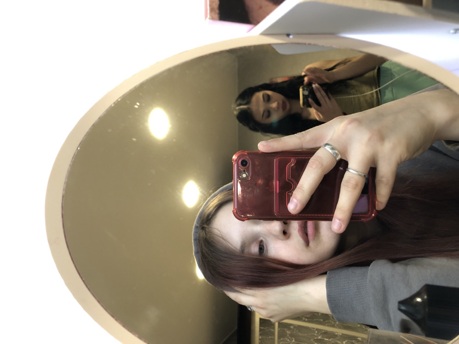 This image depicts an indoor scene in Foki, Russia, featuring two young females reflected in an arched mirror. In the foreground reflection, a female with light brown and reddish-tinted hair, wearing a grey hooded sweatshirt, is capturing the image. Her right hand, adorned with a thick silver-colored ring on the index finger and a thinner silver-colored ring on the middle finger, holds a smartphone encased in a translucent red cover. Her left hand is positioned near her head. Her face is visible, looking towards the mirror. A dark, possibly cylindrical object with a pointed top is partially visible in the bottom left corner, in front of the individual taking the photo. In the background reflection, a second female with long, dark, braided hair is seen. She wears a light green sleeveless top and light green pants, and is holding a dark-colored smartphone with both hands, focusing her attention downwards. The mirror reflects at least two circular overhead lights. A vertical white panel with an integrated light source is present on the right edge of the mirror frame.