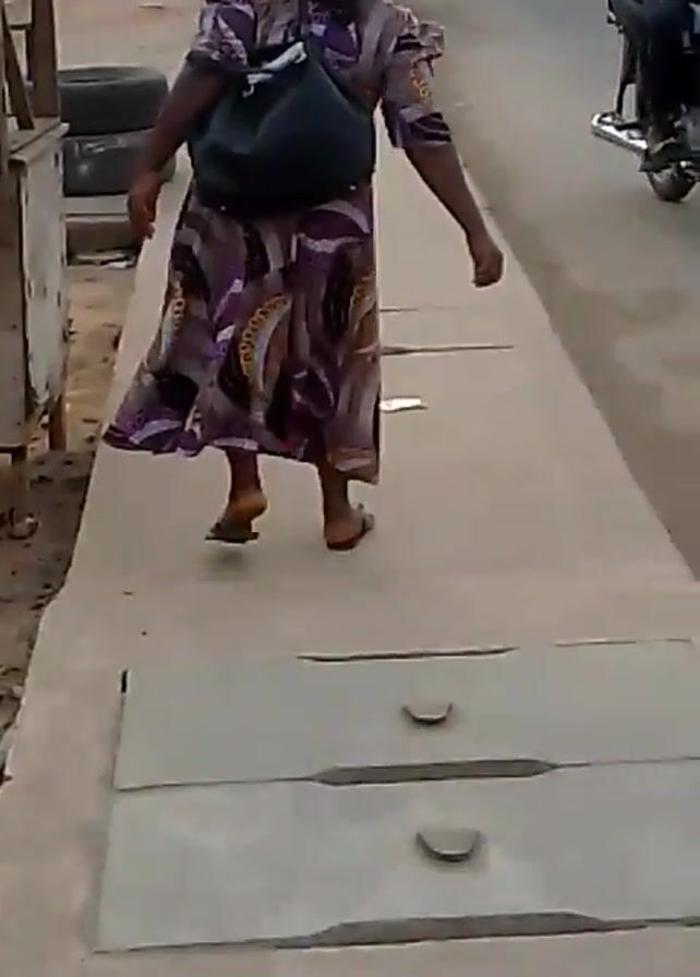 person walking away from the camera on a sidewalk. The person is wearing a long, patterned dress, sandals, and carrying a black bag over their shoulder. The sidewalk is made of concrete slabs, and there are several access panels for underground utilities. Next to the sidewalk is a road, and motorcycles and a car pass by. A small wooden structure with some tires is visible on the left of the frame. The person walks away from the camera.