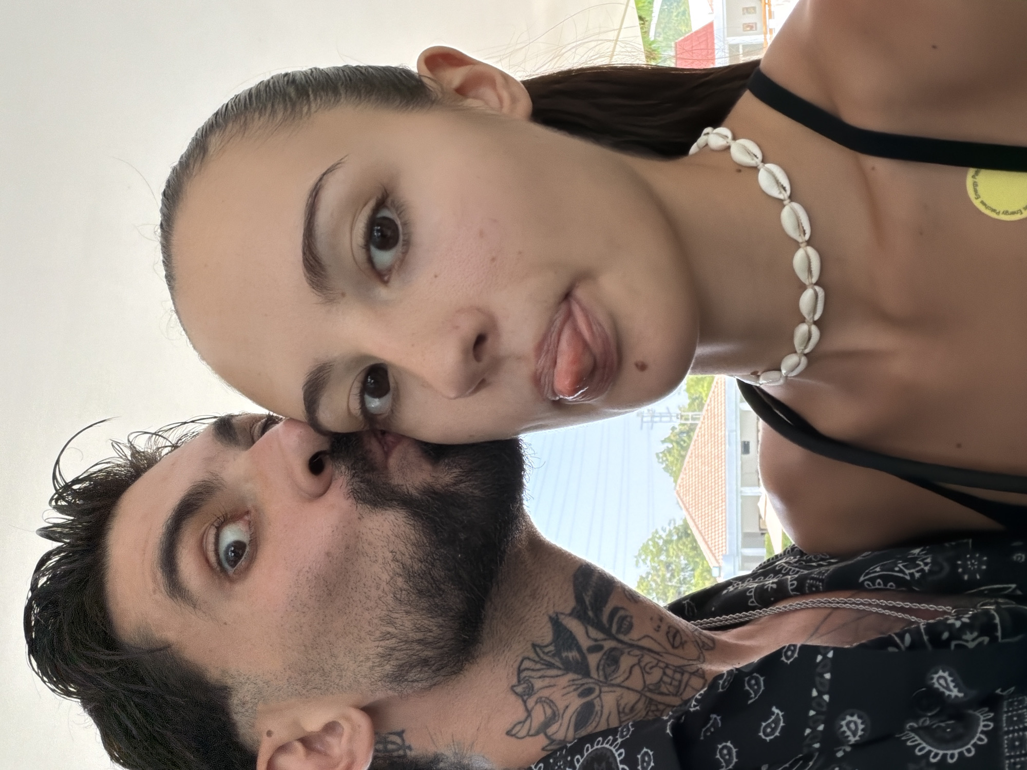 Two individuals, a male and a female, are depicted in a close-up photograph taken in Kathu, Thailand. The male, positioned on the left, has dark hair, a trimmed beard, and a mustache. His right eye is wide open and directed at the camera, while his lips are pursed against the female's right temple, suggesting a kiss. He wears a black shirt with a white paisley pattern and a silver chain. Prominent black ink tattoos, depicting stylized faces and masks, are visible on his neck. The female, positioned on the right and facing forward, has dark hair pulled back. Her right eye is open and directed at the camera, and her tongue is slightly extended. She wears a black strap top and a white choker necklace composed of cowrie shells. A circular yellow patch, partially labeled "Energy Patch," is affixed to her upper right chest. The background, largely out of focus, reveals an outdoor setting under a white overhead structure. In the middle ground, a light-colored building with a terracotta-tiled hip roof is visible, surrounded by green foliage, under a light blue sky.