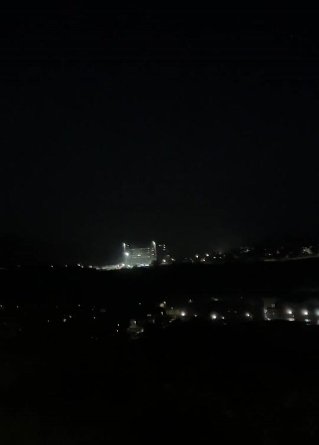 night cityscape. The focus is slightly blurred, but a number of lights can be seen in the distance. A few taller buildings stand out with their bright illumination. The camera moves erratically at times. The sky is dark and clear, with one visible star. The foreground is mostly black, obscuring any closer objects. The wind sounds are audible.