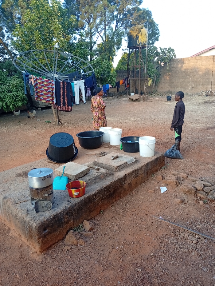 The image portrays an outdoor domestic scene in Jos, Nigeria, featuring an unpaved, reddish-brown dirt and gravel ground. Two individuals are present: a woman, dressed in a long, floral patterned garment, stands slightly left of center, facing right. To her right, a boy wearing a black long-sleeved shirt and dark shorts stands, facing left, with a black plastic bag positioned at his feet. Both individuals are oriented towards each other. In the foreground, a rectangular, raised concrete structure functions as a platform. On this platform, a metal cooking pot is stacked upon a small, dark metal charcoal or wood stove. A blue plastic scoop and a red and yellow plastic bucket are also present on the structure, alongside three square concrete slabs. On the ground adjacent to the concrete platform, several black and white plastic tubs and buckets of varying sizes are visible. To the left of the scene, a large, inverted metal satellite dish frame serves as a clothesline, holding multiple articles of clothing including patterned fabrics, light-colored trousers, and dark shirts. Two chickens are visible near the base of this structure. Lush green trees form the background on the left side. To the right, a tall, skeletal metal water tower supports a yellow-stained tank. This structure stands in front of a weathered concrete block wall, which delineates the property. Additional clothes are visible hanging on a line or draped over the wall in the distant background. The scene is illuminated by natural daylight.