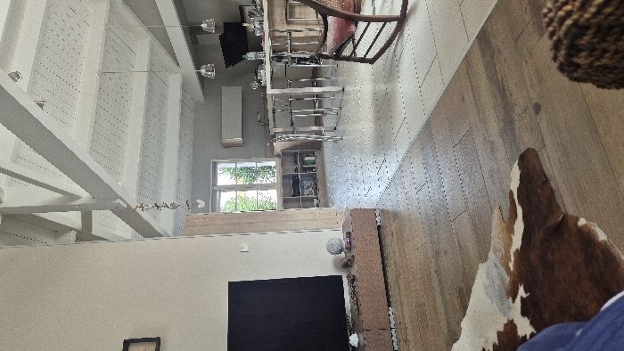 This image depicts the interior of a residential living area and kitchen in Châtelaillon-Plage, France. The scene is an open-plan space with a high, vaulted ceiling featuring exposed white beams and white paneled infill. In the foreground, a partial view of a blue upholstered seating object is visible on the bottom left. A brown and white cowhide rug is spread across light brown wooden plank flooring, which transitions to lighter square tiles in the mid-ground. A woven brown object, possibly part of furniture, is visible in the bottom right corner. On the left, a large, dark-screened television rests on a low, multi-sectional wooden media console. On the console, a spherical, illuminated decorative object (possibly a globe or lamp) is present alongside other small, indistinct items. In the mid-ground, a wooden rocking chair with a red cushion is positioned on the tiled flooring to the right. The background features a modern kitchen and dining area. A light-colored kitchen island serves as a central point, surrounded by multiple silver-colored bar stools with square bases. On the island, a clear bottle of water, a glass or bowl containing fruit, and other kitchen items are arranged. Overhead, two clear glass pendant lights hang above the island. To the rear left, a large, multi-paned white-framed window provides an exterior view of green foliage and a distant building. Below this window, a light wooden shelving unit contains books and various objects. The kitchen area also includes white wall-mounted cabinetry and a dark range hood. A decorative string of small, light-colored ornaments hangs from an overhead beam in the left mid-ground. No individuals are present.