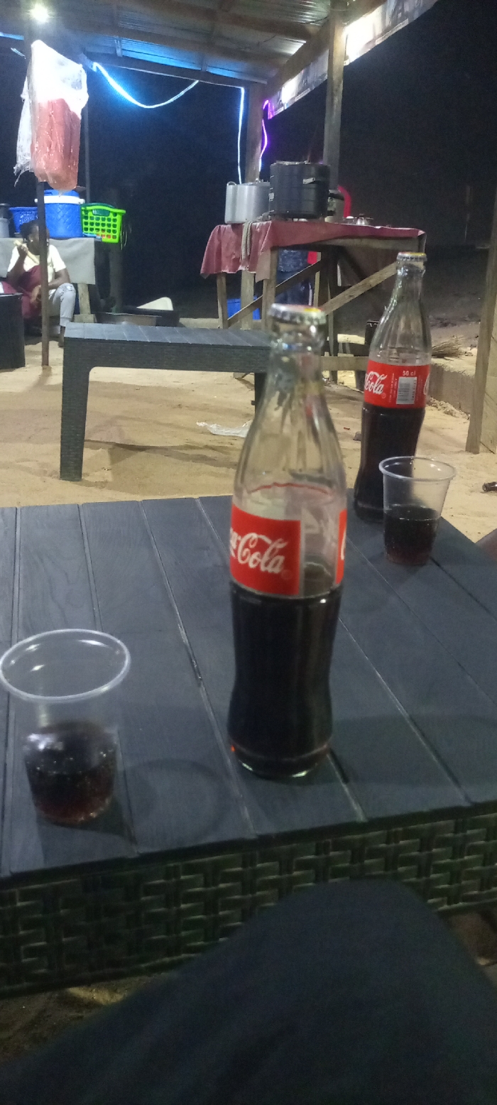 Two open Coca-Cola bottles and two plastic cups filled with the beverage sit on a dark, textured table. In the background, a dimly lit outdoor setup reveals people, containers, and cooking equipment under a corrugated metal roof adorned with blue and pink neon lights. The setting appears to be a casual food stall or outdoor eatery at night. The lower part of the frame shows a black fabric.
