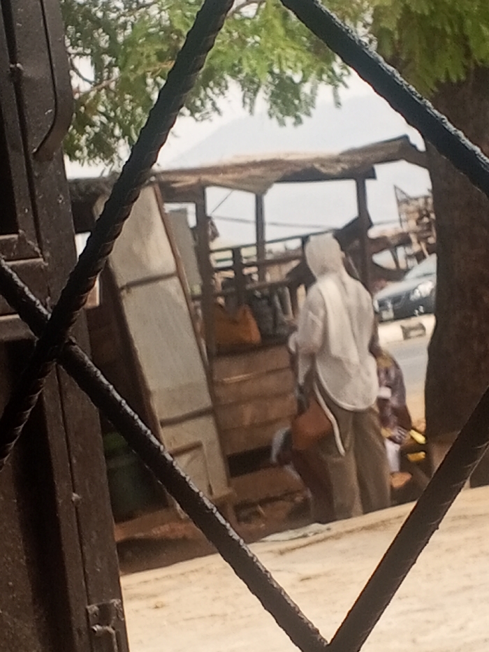 A street scene in Unknown, Unknown, is depicted through a dark, diamond-shaped metal grate in the foreground. A person stands centrally with their back to the viewer, wearing a light-colored hooded garment and dark trousers, carrying a brown shoulder bag. They are positioned near a rudimentary wooden stall with a light-colored tarp roof. Brown sacks are visible within the stall. To the right of the central figure, a partially obscured individual is seated or crouching, wearing patterned clothing. A dark-colored sedan is visible on a paved road in the background, to the right of the stall. Green foliage from trees frames the upper left and right portions of the scene. A hazy, light-colored sky and a distant mountain range form the horizon. The ground appears to be dirt or sand.