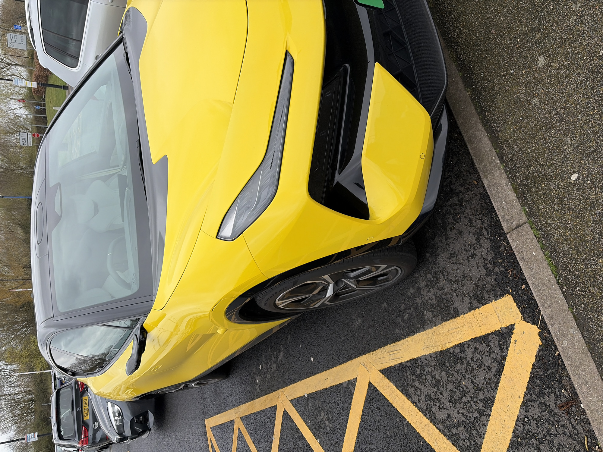 close-up of the front portion of a yellow sports car parked in a marked parking space with yellow diagonal lines on a dark asphalt surface