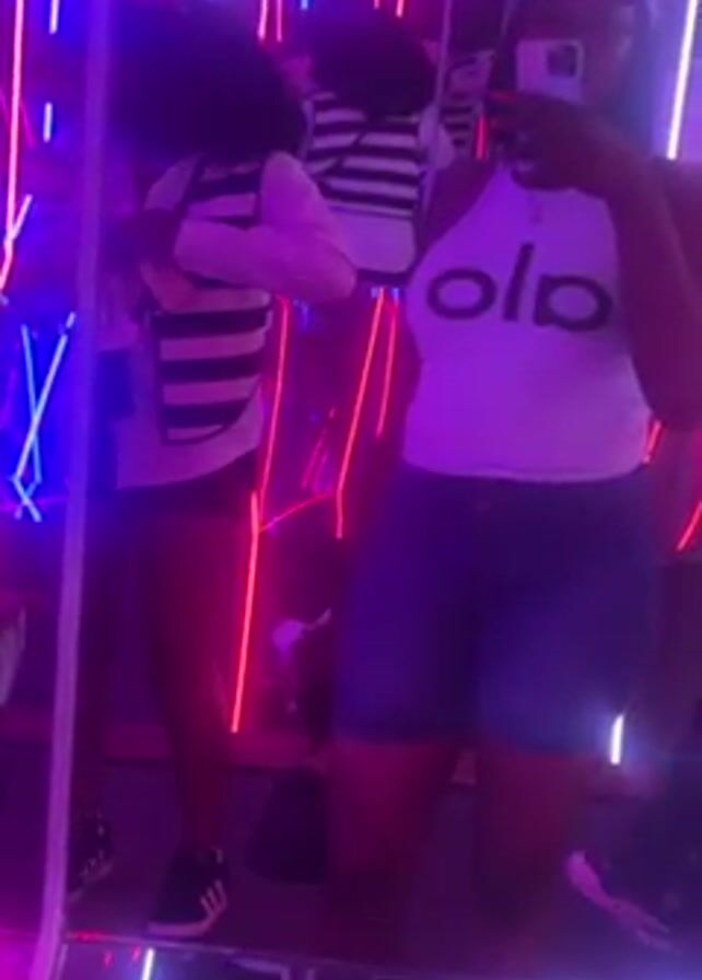 Two women are standing in a mirror room with neon lights. One of the women is holding a phone up and taking a selfie. The other woman is standing next to her and holding a striped bag. The room is filled with red, white, and blue neon lights.