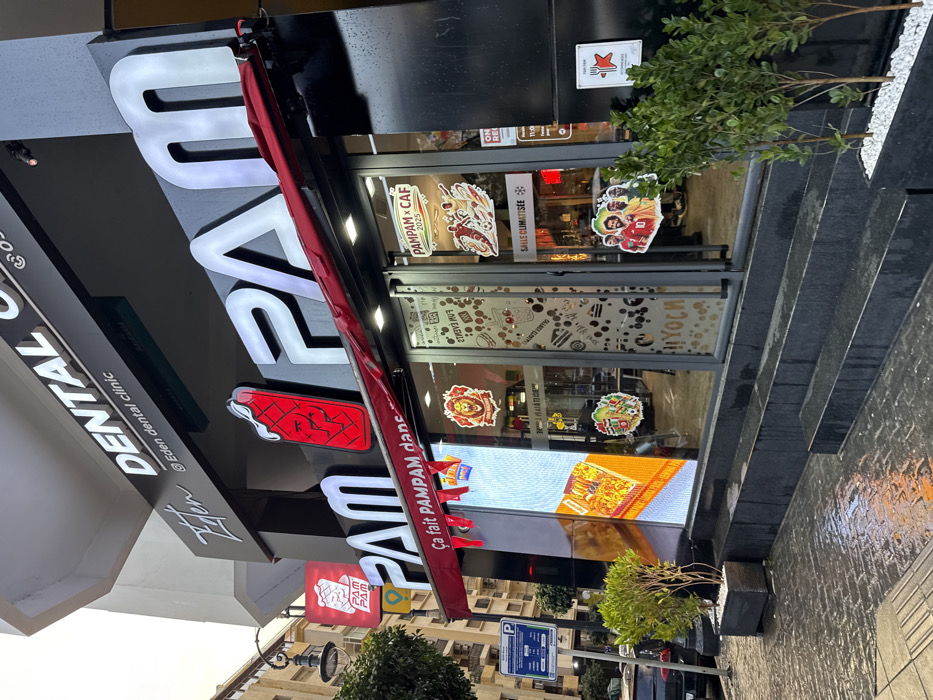 exterior of a building featuring a "DENTAL" clinic sign and a "PAM PAM" cafe. The clinic sign includes the text "@Eden dental clinic" and "Eden dental clinic" itself. The cafe's facade is decorated with stickers and displays promotional messages, including "Ça fait PAMPAM dans." There's a red awning above the cafe's entrance. The cafe also has stickers with "PAMPAM CAF 2025" and "SALLE CLIMATISEE," with a building behind and trees on the street.