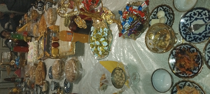 - "This image depicts an indoor gathering in Fayziabad, Uzbekistan, centered around a long table laden with an extensive variety of food and drink" by FM-0vJxo1, licensed under CC BY 4.0