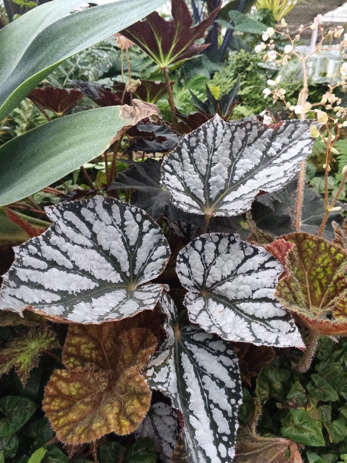 The image showcases a variety of Begonia plants. Prominently featured are several silver-patterned leaves with dark veins, exhibiting intricate details. Some leaves have a brown and yellow coloration. Other foliage includes burgundy leaves with green veins and long green leaves. Small white flowers are also visible among the dense vegetation. The overall impression is a lush, layered display of diverse Begonia foliage.