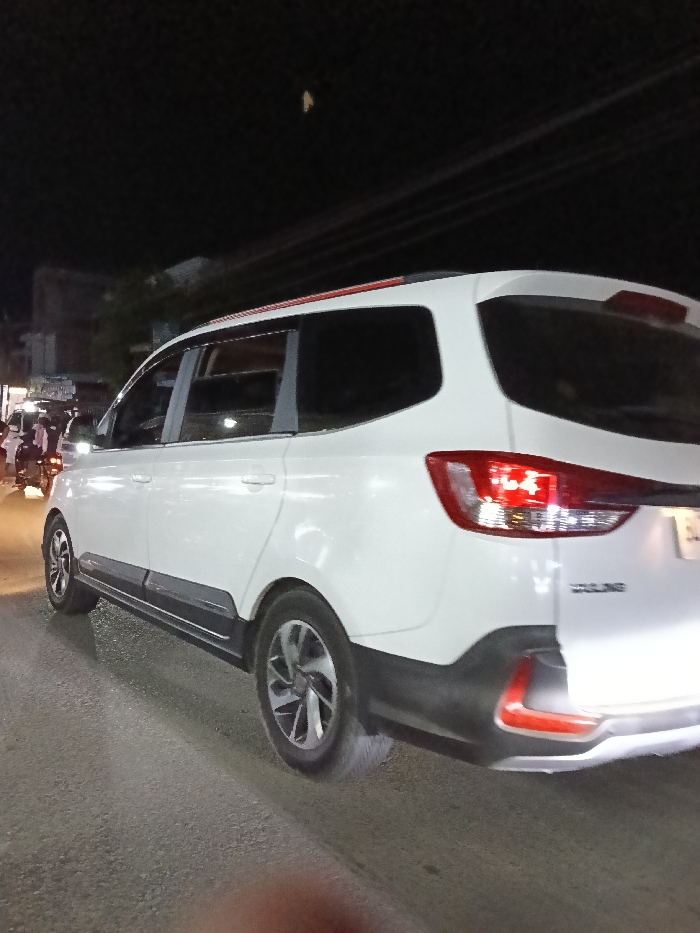The scene depicts a nighttime view on a paved road in the city of Sangso, Indonesia. The primary subject is a white Wuling Almaz multi-purpose vehicle/SUV, positioned with its rear-right and right side facing the camera. The vehicle features dark tinted windows, black lower body trim, and black roof rails with a red accent strip. Its red taillights and brake lights are illuminated, and a "WULING" badge is visible on the tailgate. A partial license plate is discernible on the right side of the rear bumper. The vehicle is equipped with dark grey multi-spoke wheels. In the blurred background to the left, other vehicles, including at least one motorcycle or scooter and a car, are visible with their lights illuminated, indicating traffic. Overhead power lines are faintly visible against the dark sky. Distant buildings are partially obscured in the left background. A small, light-colored, indistinct object appears in the upper central sky. A reddish, out-of-focus blur is present at the bottom center of the image, consistent with a finger partially covering the camera lens.